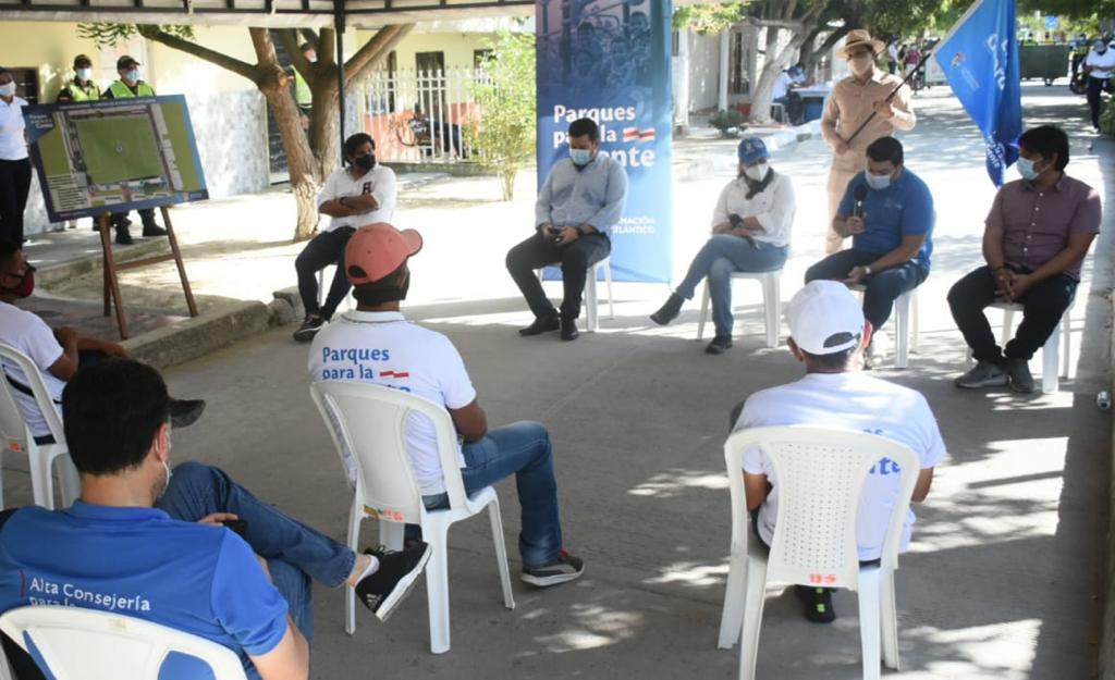 La secretaria de Infraestructura departamental, Nury Logreira; el alcalde municipal, Gustavo de la Rosa; el gerente del programa, Jorge Ávila; y el consejero para la Convivencia, Manuel Díaz, junto con un grupo de guardianes del parque y del contratista de la obra, se dieron cita en esta cancha del municipio para arrancar de forma oficial con los trabajos que transformarán 8.187 metros cuadrados de espacio público con una inversión estimada de 5.525 millones de pesos.