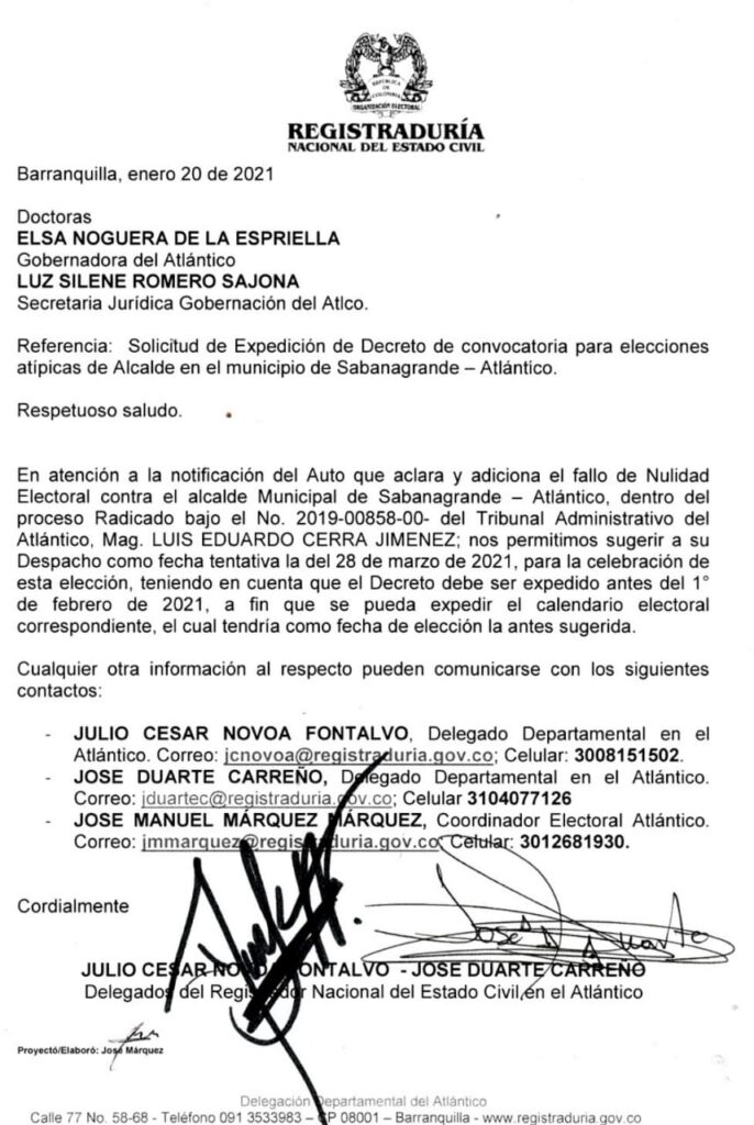 A través de comunicación enviada por los delegados a la Gobernadora del Atlántico, Elsa Noguera y a Luz Romero, Secretaria Jurídica de la Gobernación del Atlántico solicitan la expedición del decreto de convocatoria de elecciones atípicas en esa localidad del oriente del Atlántico con fecha 20 de enero de 2021.
