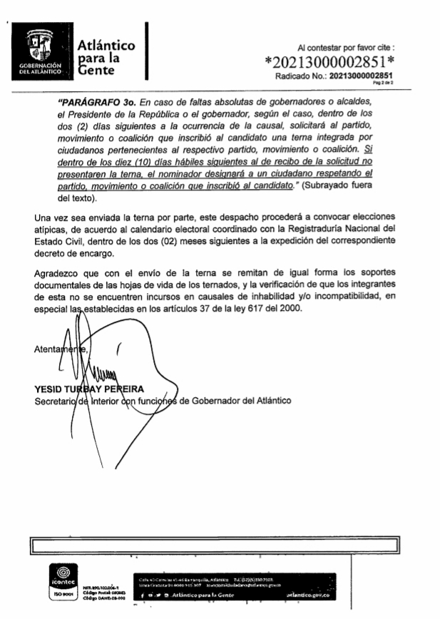 Se espera ahora la respuesta del Partido Liberal, quien deberá radicar comunicación con el nombre de los tres ciudadanos que harán parte de esta terna y una vez se surta el acto de designación, se procederá a convocar en dos meses a elecciones atípicas en el municipio de Sabanagrande.