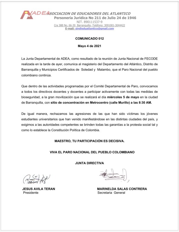 Asi lo confirmó el Presidente de la Asociación de Educadores del Atlántico ADEA, Jesús Ávila, quien a través de comunicado de fecha de hoy asegura que la Junta Departamental ADEA como resultado de la reunión de la junta nacional de FECODE realizada en la tarde de ayer comunicó al magisterio del departamento del Atlántico, Barranquilla, Soledad y Malambo que el paro nacional continúa y en el Atlántico permanecen en pie de lucha.
