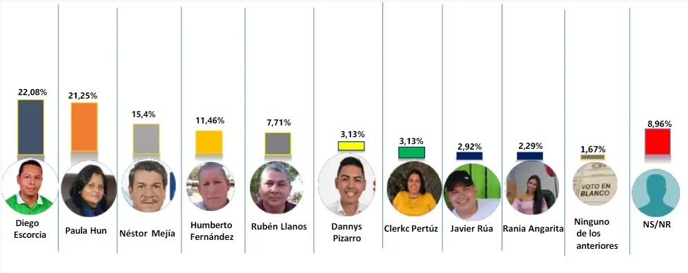 En ese mismo orden le siguen el Ingeniero Néstor Mejía con 15.4%; el exconcejal Humberto Fernández con 11.46%,; ninguno de los anteriores con 8.96%, el líder cívico Rubén Llanos con 7.71%, el periodista Dannys Pizarro con 3,13%, Clerck Pertuz con 3.13%, el concejal Javier Rúa con 2,92% y con 2,29% la actual concejal Rania Angarita Escorcia.