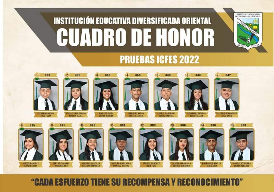 La Institución Educativa Diversificada Oriental de Santo Tomás en su promoción 2022 exalta con orgullo hoy sus resultados en las pruebas saber 11 donde alcanzó con 15 de sus estudiantes puntaje por encima de 300 puntos.
