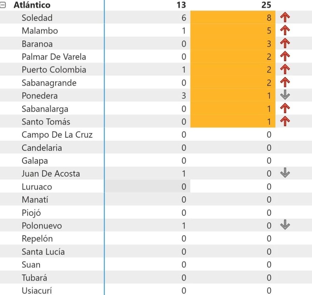 En el orden de las estadísticas aparece Baranoa con 3 casos le siguen Palmar de Varela, Puerto Colombia y Sabanagrande con 2 casos respectivamente. Cierra el reporte Ponedera, Sabanalarga y Santo Tomás con un caso.