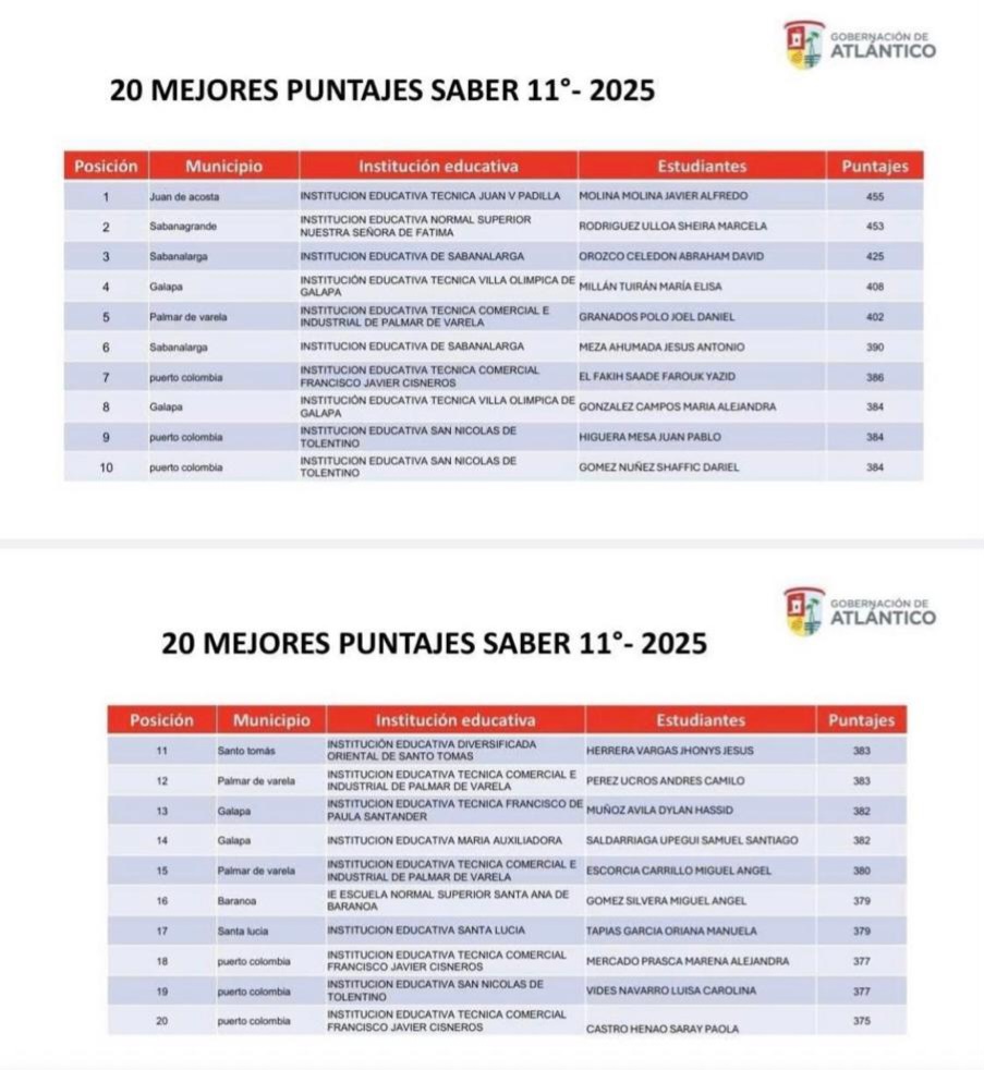 La Gobernación del Atlántico dio a conocer el ranking de los 20 mejores puntajes de las pruebas saber 11, entre ellos sacan la cara por la zona oriental estudiantes pertenecientes a la Escuela Normal Superior Nuestra Señora de Fatima de Sabanagrande, Institución Educativa Técnica Comercial e Industrial de Palmar de Varela y de la Institución Educativa Diversificada Oriental de Santo Tomás.