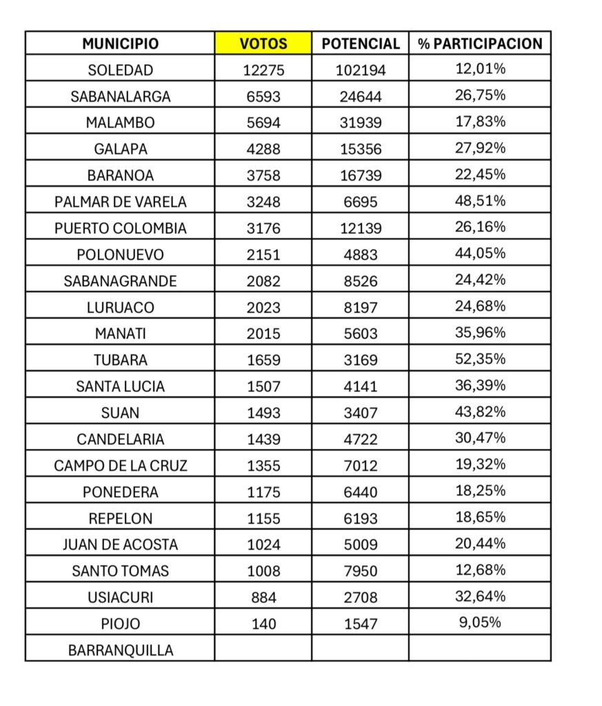 Se destaca en la zona oriental la gran participación que hubo de jóvenes en el vecino municipio de Palmar de Varela donde acudieron a las urnas 3.248 jóvenes de 6.695 potenciales votantes con una participación de 48, 51% ocupando el cuarto puesto en participación a nivel nacional, según la autoridad electoral.
